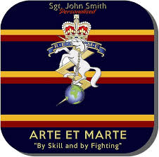 Logo/Badge: The cap badge commonly features a shield with a horse and lightning bolts, surrounded by a garter with the motto “Arte et Marte”.